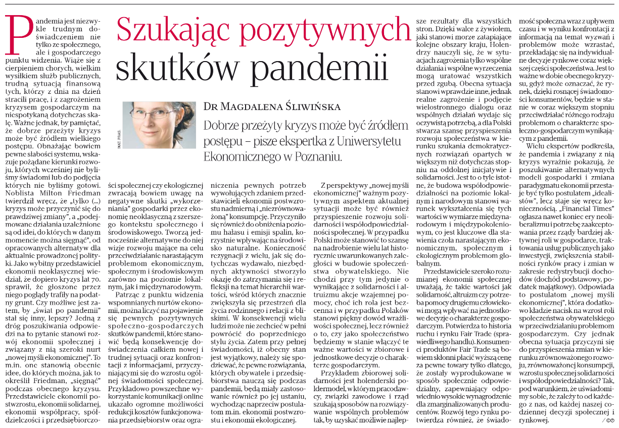 Przygotowany przez dr Magdalena Śliwińska artykuł "Szukając pozytywnych skutków pandemii" ukazał się w piątkowo-niedzielnym wydaniu Rzeczpospolitej (14-16.08.2020), Ekonomia&rynek, A21. Zapraszamy do lektury załączonego tekstu.