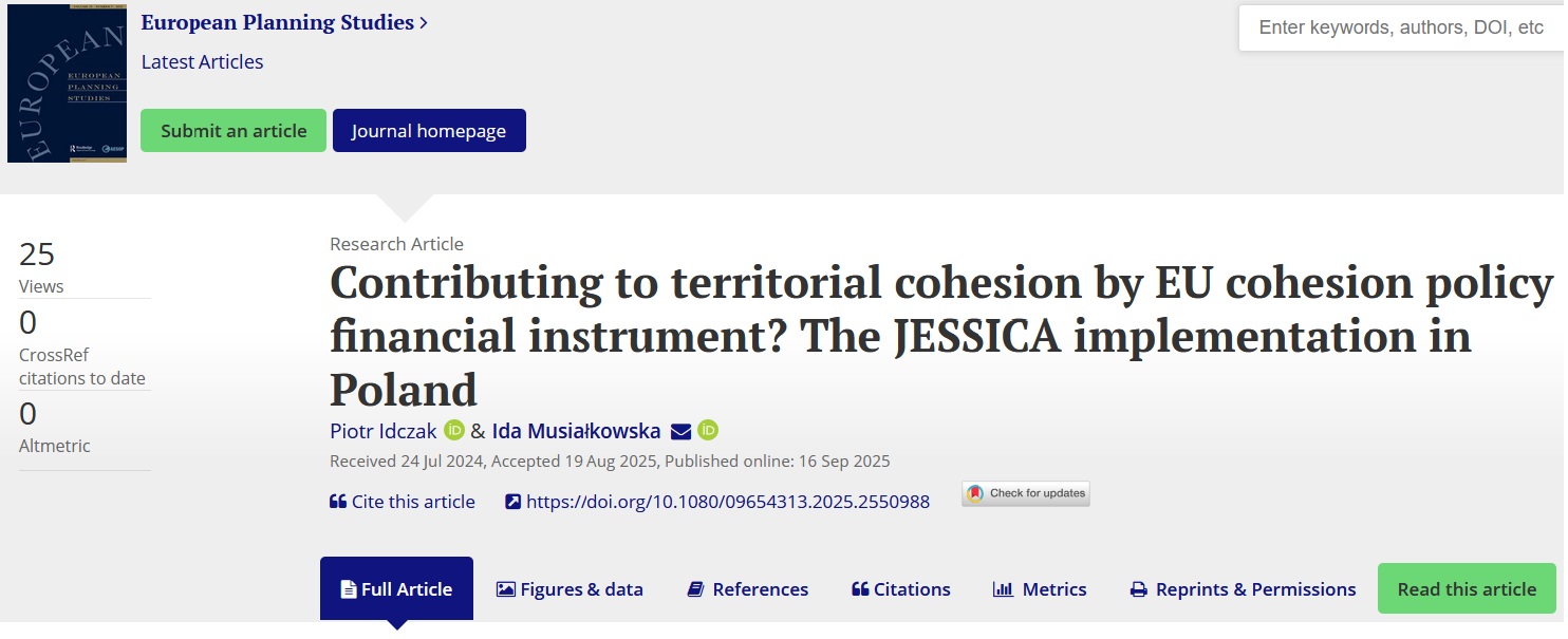 W "European Planning Studies" ukazał się artykuł autorstwa prof. UEP Piotra Idczaka oraz prof. UEP Idy Musiałkowskiej z Katedry Europeistyki pt. "Contributing to territorial cohesion by EU cohesion policy financial instrument? The JESSICA implementation in Poland" Całość tekstu dostępna pod linkiem: https://www.tandfonline.com/doi/full/10.1080/09654313.2025.2550988