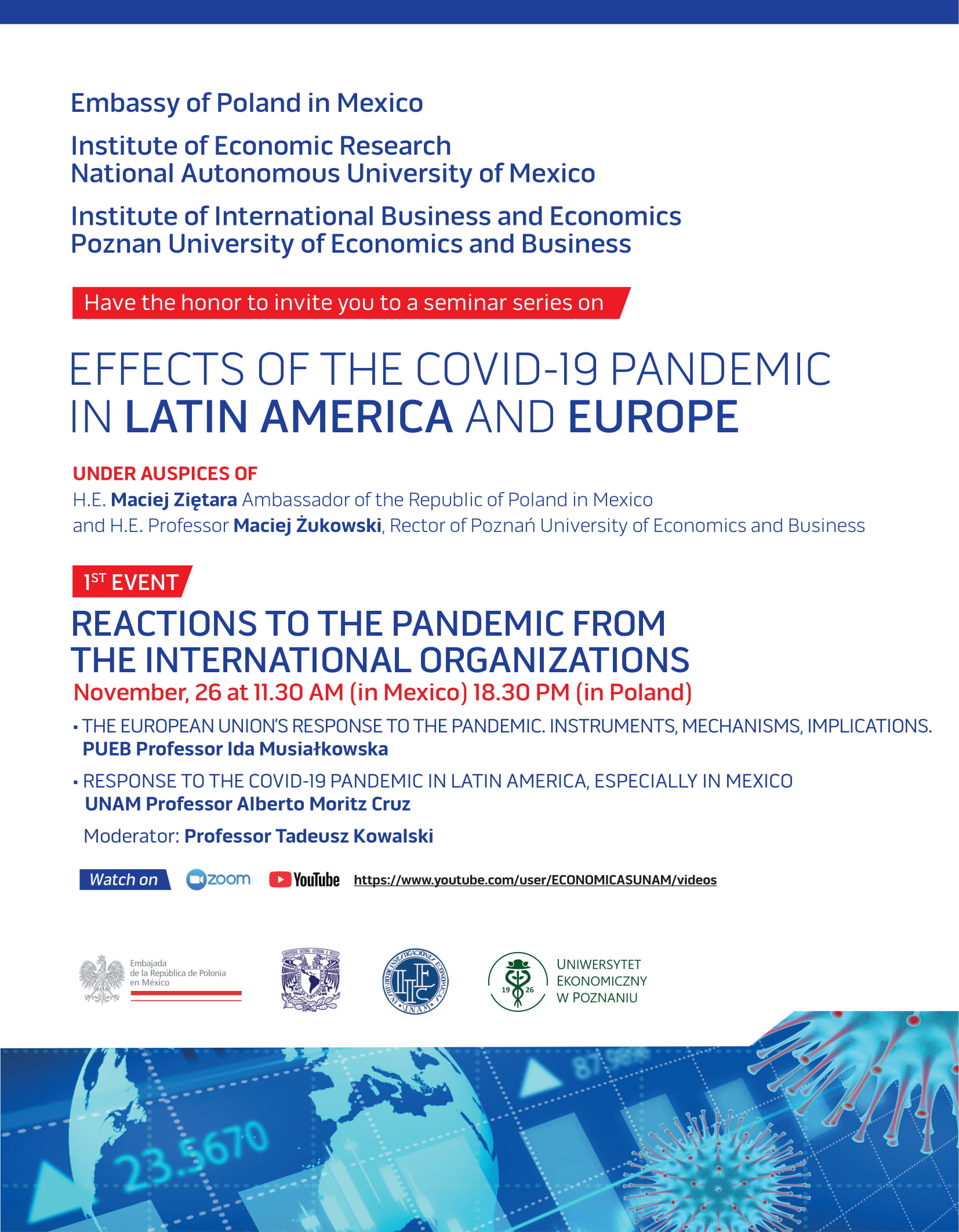 Serdecznie zapraszamy na pierwsze seminarium z cyklu "The Effects of the COVID-19 Pandemic in Latin America and Europe". Seminarium organizowane jest przez Instytut Gospodarki Międzynarodowej UEP i Katedrę Europeistyki wspólnie z Ambasadą RP w Meksyku oraz Instytutem Badań Ekonomicznych Universidad Nacional Autonoma de Mexico i odbędzie się 26.11. o godz. 18.30 (CET) na Zoom. Seminarium można śledzić też na youtube: https://www.youtube.com/user/ECONOMICASUNAM/videos